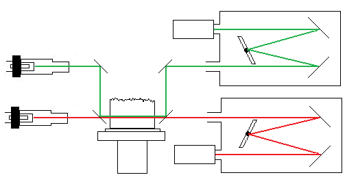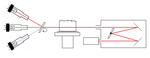 W monochromatorze w układzie Littrowa wiązka promieniowania wchodząca przez szczelinę wejściową pada na zwierciadło wklęsłe, które kieruje ją na siatkę dyfrakcyjną. Po rozszczepieniu wiązka promieniowania wraca na zwierciadło, które kieruje ją do szczeliny wyjściowej. Zmiana położenia siatki dyfrakcyjnej, położonej poza osią symetrii zwierciadła powoduje zmianę długości fali promieniowania trafiającego do detektora (rys. 6A). Podobna jest konstrukcja monochromatora Eberta (rys. 6B) z tym, że siatka dyfrakcyjna umieszczona jest w osi symetrii zwierciadła. W najczęściej stosowanym monochromatorze Czernego-Turnera, znajdują się dwa sferyczne zwierciadła. Pierwsze kieruje wiązkę wpadająca do monochromatora na ruchomą siatkę dyfrakcyjną. Drugie „odbiera” rozszczepioną wiązkę po opuszczeniu siatki i kieruje do szczeliny wyjściowej. Kąt ustawienia siatki determinuję wybór zakresu długości promieniowania, które będzie trafiało na drugie zwierciadło, a następnie do układu detekcyjnego (rys. 6C) . Mechaniczna zmiana kąta nachylenia siatki powoduje zmianę długości promieniowania trafiającego do detektora.