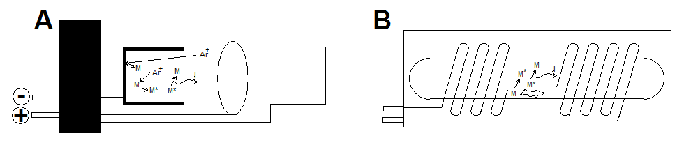 Rysunek 5. Lampa z katodą wnękową (A) i lampa bezelektrodowa (B)