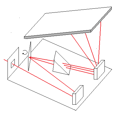 Monochromator Echelle’a oprócz siatki dyfrakcyjnej posiada wbudowaną dodatkową soczewkę lub pryzmat oraz płaszczyznę dyfrakcyjną. Monochromator ten stanowi przyszłościowe rozwiązanie. Promieniowanie padające z atomizera trafia na układ zwierciadeł. Na siatce dyfrakcyjnej ulega rozszczepieniu i dalej trafia na pryzmat, powodujący dodatkowe rozszczepienie tego promieniowani. Detekcja następuje nie w jednym punkcie, a na płaszczyźnie (rys. 7). Każdy punkt takiej płaszczyzny jest miejscem, w którym odczytane może być promieniowanie o bardzo ściśle określonej długości fali, dzięki czemu możemy prowadzić oznaczenia przy wielu długościach fali równocześnie.
