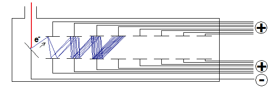 Detektorami najczęściej stosowanymi w absorpcyjnej spektrometrii atomowej są fotopowielacze. Zasada działania fotopowielacza jest stosunkowo prosta: kwant promieniowania trafia na katodę światłoczułą, wybijając z niej elektron, który przyspiesza w polu elektrycznym, wytworzonym przez elektrody zwane dynodami. Trafiając w kolejne dynody elektron wybija kolejne elektrony (rys. 8). Dynoda daje wielokrotne powielenie ilości elektronów, co za tym idzie przepływ możliwego do zmierzenia prądu elektrycznego.