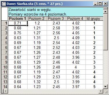 Rys. 1. Dane wejściowe do analiz – arkusz Statistica