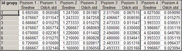 Powyżej zostały obliczone statystyki dla kolejnych poziomów w całości. Zauważmy jednak, że podczas zbierania danych pomiarowych zostały one podzielone na grupy (klasy), o czym mówi zmienna grupująca „Id grupy” w pliku danych. Dane w obrębie grupy mogły być zebrane np. w różnym czasie, co mogło wprowadzić dodatkową zmienność (niepewność) do pomiarów i warto przyjrzeć się statystykom w kolejnych grupach (rys. 3.).