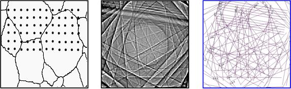 Metoda powyższa opiera się na automatycznym pomiarze orientacji kryształu (ACOM- automate crystal orientation measurement) [9] punkt po punkcie (rys.1a), przez rejestrowanie (rys. 1b) i indeksowanie (rys. 1c) linii Kikuchi’ego.