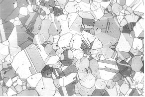 Na rys.2 przedstawiono typową mikrostrukturę brązu, w której występują równoosiowe ziarna zawierające liczne bliźniaki. Badania mikroskopowe wykazały, że nie wszystkie granice ziaren są kontrastowe a poza tym nie zawsze można rozróżnić między granicą ziaren dużego kąta a granicą bliźniaczą.