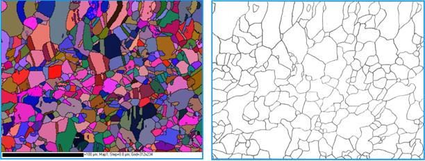 Do kontrastowania granic ziaren, są wykorzystane zmiany lokalnych orientacji ziaren z uwzględnieniem punktów pomiarowych, w których orientacja nie jest określona. Przez połączenie sąsiednich punktów zbioru (oraz interpolację) otrzymuje się zrekonstruowane granice ziaren dużego kąta na zgładzie, które przyporządkowane mikrostrukturze OIM, rys.3a, ujawniają jej strukturę ziarnową.