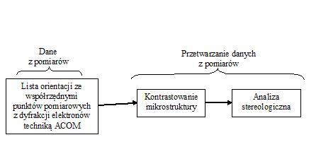 Tych ograniczeń nie ma metoda c), którą jednak przez długi czas ograniczały trudności techniczne związane z efektywnym pomiarem lokalnych orientacji krystalograficznych w wielu, regularnie rozmieszczonych punktach zgładu. Dopiero automatyzacja pomiaru metodą EBSD umożliwiła otrzymanie dużych zbiorów orientacji w stosunkowo krótkim czasie. Poprzez komputerowe opracowanie takich zbiorów danych można m.in. zrekonstruować niektóre geometryczne elementy mikrostruktury. Efektywna metoda kontrastowania granic ziaren (faz) polega na ich rekonstrukcji za pomocą różnic orientacji, wyznaczonych w sąsiednich punktach pomiarowych. Wewnątrz ziaren różnice orientacji są bliskie zeru, natomiast dla punktów rozdzielonych granicą są one duże. W pracy [8] przedstawiono próbę opracowania możliwie prostej metody kontrastowania granic ziaren w metalu za pomocą różnic lokalnych orientacji z uwzględnieniem pewnych szczególnych informacji zawartych w zbiorach empirycznych danych.