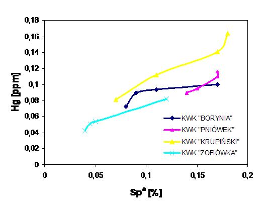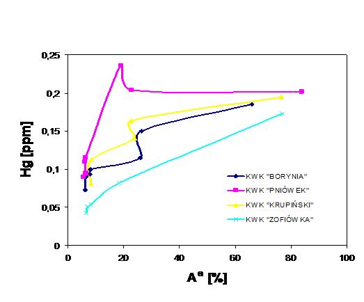 Zaobserwowano, iż dla wszystkich badanych węgli wraz ze wzrostem zawartości popiołu rośnie zawartość rtęci i jednocześnie maleje procentowy udział pierwiastka C, co potwierdza iż rtęć nie jest związana z substancją organiczną węgla kopalnego. W badanych węglach koksowych pochodzących z JSW S.A. zawartość rtęci rośnie wraz ze wzrostem siarki pirytowej. Średnia zawartość rtęci w węglach handlowych JSW S.A. (dla Aa <10%) waha się w przedziale 0,049 – 0,101 ppm. Oznaczona w pracy zawartość rtęci w węglach koksowych pochodzących z JSW S.A. jest niższa niż średnia zawartość rtęci w polskich węglach kamiennych 0,141 ppm [5].