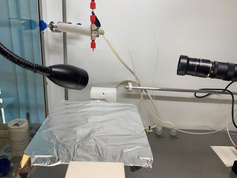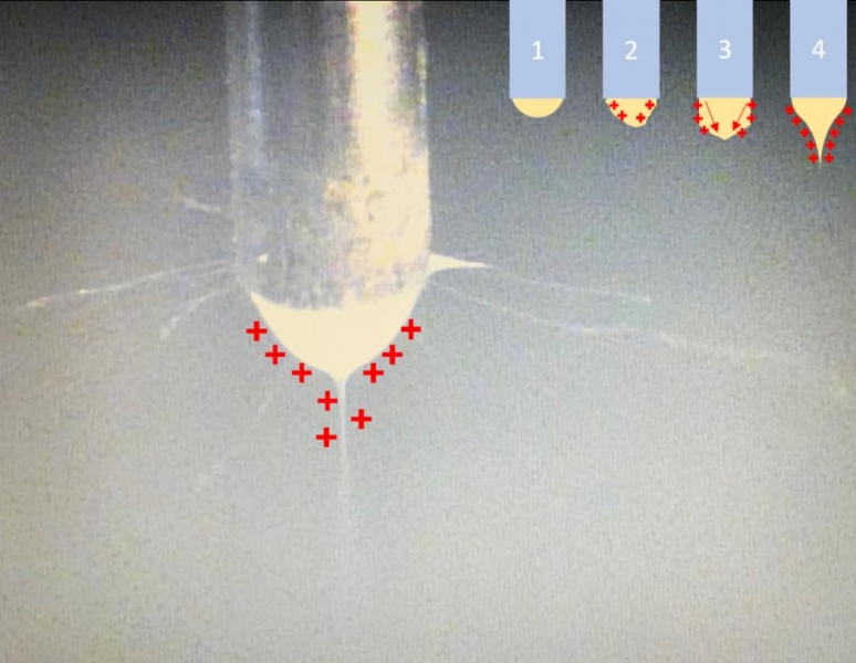 Rys. 4. Zdjęcie stożka Taylora w trakcie procesu elektroprzędzenia, uformowanego przez roztwór