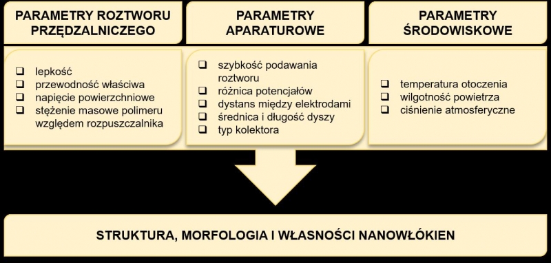 Na strukturę i morfologię, a przede wszystkim własności otrzymywanych nanowłókien w procesie elektroprzędzenia wpływ mają parametry samego procesu, które zwykle dzieli się na trzy grupy: parametry roztworu przędzalniczego, aparaturowe (czyli takie, których ustawienie zależy od urządzenia) oraz środowiskowe (Rys. 5).