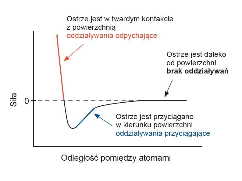 Podstawą działania mikroskopii sił atomowych są oddziaływania pomiędzy atomami powierzchni a atomami sondy. W skład tych oddziaływań wchodzą siły coulombowskie i van der Waalsa. Powodują one przyciąganie się atomów na większych odległościach i odpychanie na niewielkich (rys. 2).