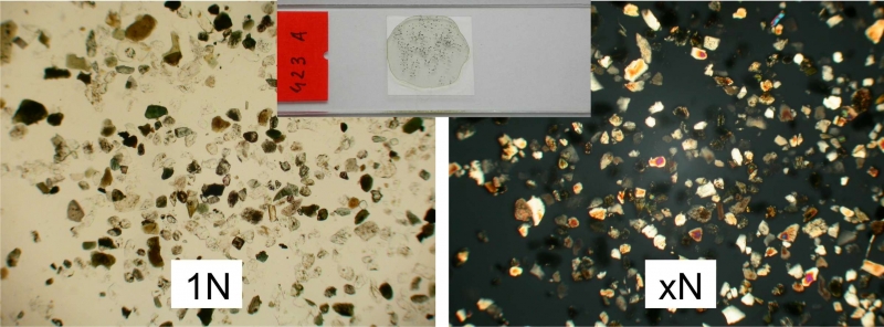 Ryc. 1. Preparat nasypowy z szlichu bez wykonanej separacji minerałów ciężkich (obraz w mikroskopie polaryzacyjnym 1N- pojedynczy nikol, xN- skrzyżowane nikole)