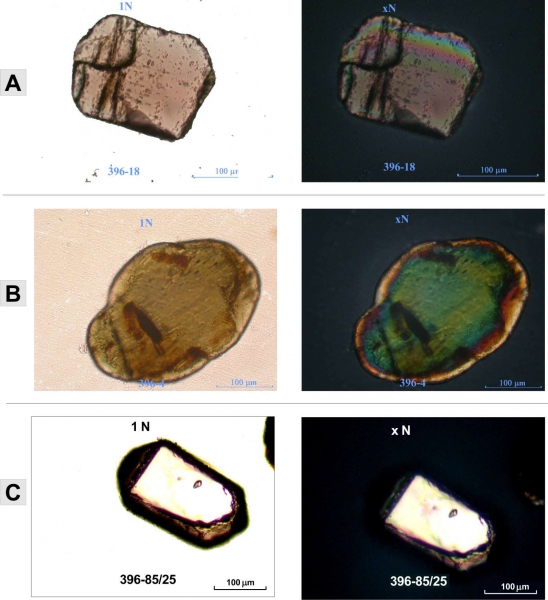 Ryc. 2. Przykłady minerałów ciężkich: A-turmalin, B-amfibol, C-cyrkon. Obrazy z mikroskopu polaryzacyjnego, 1N- pojedynczy nikol, xN- skrzyżowane nikole.
