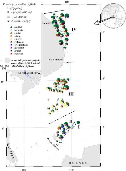 Ryc. 3. Schematyczna mapka podziału na prowincje minerałów ciężkich, wraz z wykresami kołowymi zawartości przezroczystych minerałów diagnostycznych dla obszary szelfu kontynentalnego w zachodniej części Morza Południowochińskiego (w oparciu o: Jagodziński, 2005)