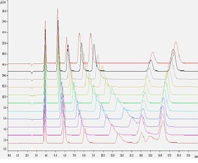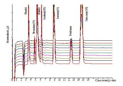 Po włączeniu chromatografu jonowego i uruchomieniu pompy należy wykondycjonować układ, co związane jest z jego przemywaniem eluentem przez około 10-30 minut, aż do uzyskania stabilnej linii bazowej. Prawidłowe przygotowanie chromatografu jonowego do pracy gwarantuje uzyskiwanie powtarzalnych wyników analizy. Przykładowe chromatogramy 10 próbek wzorcowych anionów przedstawiono na rysunku 1.