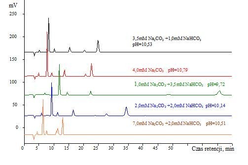W niektórych wypadkach np. kolumny Metrohm Metrosep 7 wraz ze zmianą temperatury może dojść do zmiany kolejności wymywania anionów, szczególnie jonów NO3 i PO43-.