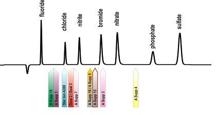 Uwagi te dotyczą przede wszystkim kolumn rozdzielających starszej generacji. Nowoczesne wysokoselektywne kolumny anionowymienne charakteryzują się dobrym rozdzielaniem jonów F wobec piku nastrzykowego i jonów Cl. Dla tych kolumn różnice w czasach retencji jonów F i Cl są na tyle duże, że kolumny te umożliwiają jednoczesne rozdzielanie jonów F, ClO2, BrO3 i Cl, które euluują z kolumny rozdzielającej w tej właśnie kolejności. Jeżeli na chromatogramie pojawią się inne dodatkowe niezidentyfikowane piki pomiędzy pikami odpowiadającymi jonom  F i Cl, a przedmiotem analiz nie są próbki wody chlorowanej (ClO2) lub ozonowanej (BrO3) to pochodzą one najprawdopodobniej od jonów niskocząsteczkowych kwasów karboksylowych (np. HCOO, CH3COO).