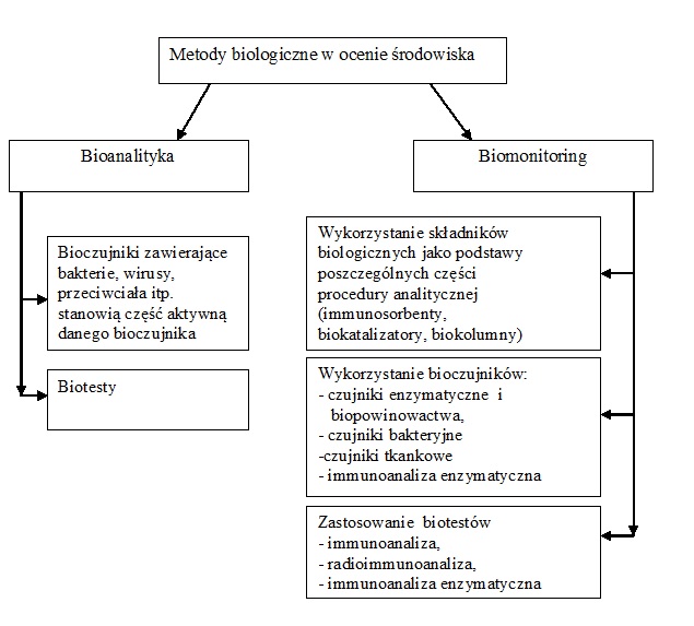Intensywny rozwój przemysłu, rolnictwa oraz wzrost liczby ludności na świecie powoduje wzrost emisji zanieczyszczeń do środowiska naturalnego. Wykorzystywane obecnie techniki laboratoryjne umożliwiają ocenę skażenia, jednak nie dostarczają informacji o skutkach oddziaływania zanieczyszczeń na organizmy. Wynika to często z braku wiedzy o losach wprowadzonej do środowiska substancji oraz o jej przemianach. Dlatego uważa się, że metody biologiczne oceny stanu środowiska są nie tylko doskonałym uzupełnieniem metod chemicznych, ale w licznych przypadkach są jedynymi metodami monitorowania na podstawie której można scharakteryzować aktualny stan środowiska. Należą do metod czułych, stosunkowo niedrogich i szybkich. W biologicznych metodach kontroli środowiska można wyróżnić bioanalitykę i biomonitoring. Na rysunku 1 przedstawiono schematycznie zastosowanie metod biologicznych w kontroli jakości elementów środowiska [6 ].