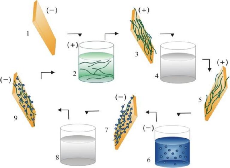 Rys. 2. Schemat tworzenia filmu metodą „warstwa po warstwie”. (1) – ujemnie naładowane podłoże, (2) – roztwór polikationu, (3) – adsorpcja pierwszej warstwy tworzonego filmu, (4), (8) – roztwory do płukania, (5) – pierwsza trwale zaadsorbowana warstwa po płukaniu, (6) – ujemnie naładowana suspensja nanocząstek , (9) – druga trwale zaadsorbowana warstwa filmu po płukaniu.