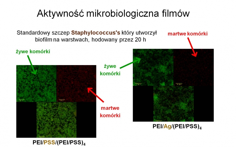 Hodowano wzorcowy szczep gronkowca skórnego tworzący biofilm na płytce zawierającej nanocząstki srebra, równocześnie na płytce referencyjnej bez nanocząstek przez 20 godzin, następnie były barwione fluorescencyjnie. Świecące na zielono to żywe komórki bakteryjne, a czerwone punkty to komórki martwe (w zestawie 3 zdjęcia – same żywe, same martwe oraz nałożenie martwych na żywe). Patrząc na te zdjęcia widać wyraźnie różnicę w ilości biofilmu, zdecydowanie mniej jest na płytce pokrytej srebrem, co świadczy o tym, że nanocząstki srebra wykazują pożądane działanie przeciwbakteryjne.