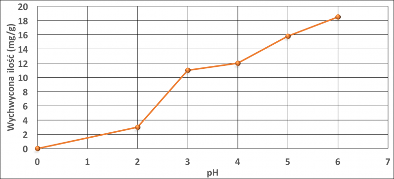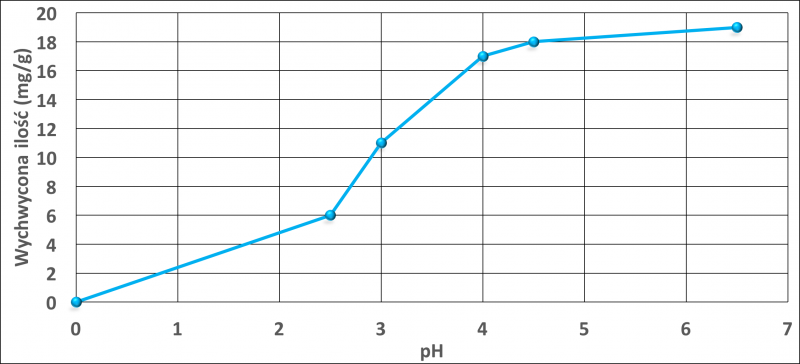 Rys. 1. Wpływ pH na wychwyt miedzi przez torf przy początkowym stężeniu 100 mg / l w 25°C. Rysunek wykonany na podstawie danych w pracy [18].