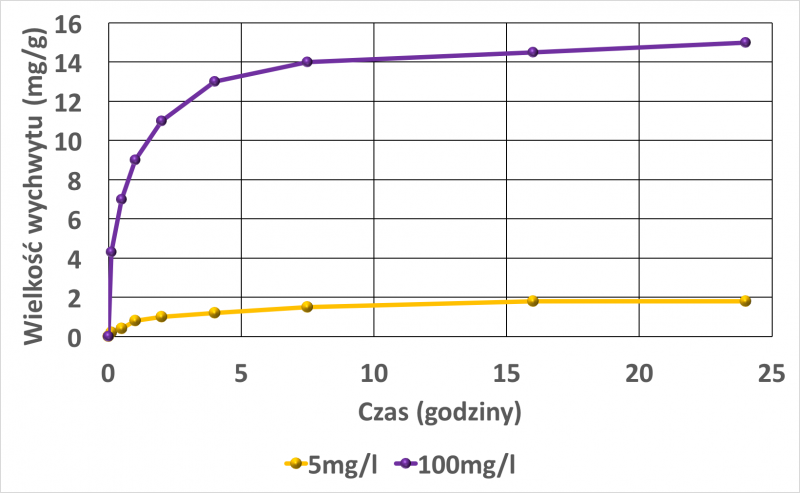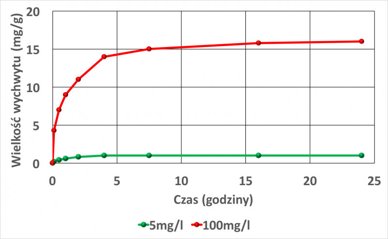 Rys. 4. Wychwyt jonów miedzi, jako funkcja czasu w zależności od różnych stężeń jonów w roztworze. Początkowe stężenie miedzi w roztworze 100 mg / l, oraz 5 mg /l.Rysunek wykonany na podstawie danych w pracy [18].