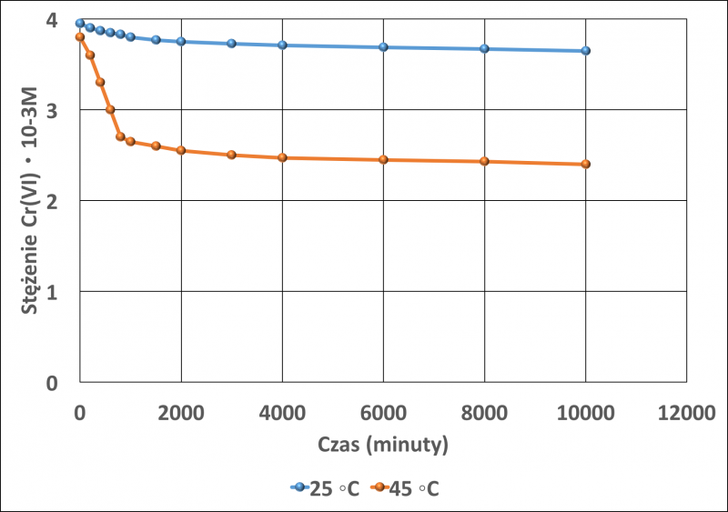 Wiele materiałów było testowanych pod kątem usuwania chromu z wód i ścieków. Wiele z nich to żywice jonowymienne, czy też zmodyfikowane włókna naturalne lub chemicznie zmodyfikowane biomasy. We wszystkich przypadkach koszt materiału stosowanego do usuwania chromu był wyższy. W pracy [20], naturalny torf został przetestowany jako potencjalny adsorbent chromu na szóstym stopniu utlenienia. Do badań stosowano komercyjny produkt Biomatrix Gold (Mérida, Spain) stosowany do usuwania organicznych zanieczyszczeń ze ścieków. Właściwości torfu scharakteryzowano pod kątem uziarnienia, popiołu, właściwości termicznych i pH. Badania przeprowadzono stosując 0,1 g torfu w kontakcie z 20 ml wodnego roztworu dwuchromianu potasu o początkowym stężeniu równym 4∙10-3 M. Badania adsorpcji prowadzono w czterech różnych temperaturach: 15, 25, 35 i 45°C w Selecta Unitronic-O (termostatowa łaźnia z wytrząsarką). Stężenie Cr (VI) w roztworze oznaczano po upływie zadanego czasu, przy pomocy Thermo Electron S Series, absorpcyjnego spektrofotometru atomowego. Na rysunku 6 przedstawiono adsorpcję chromu (VI) temperaturze 25 i 45oC.