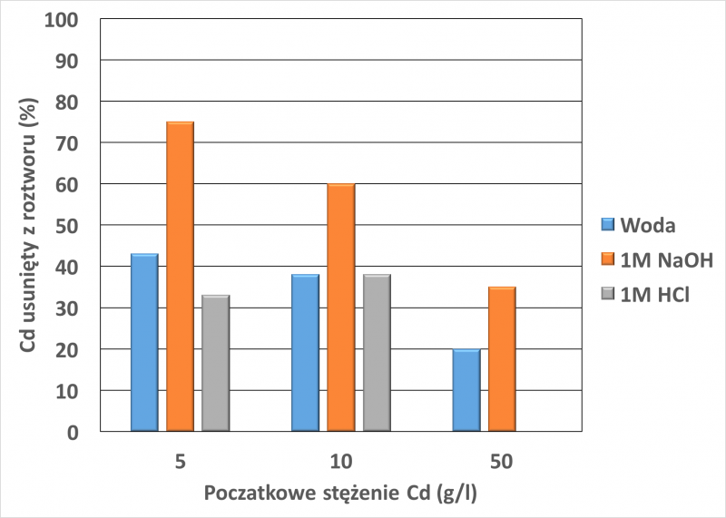 Torf aktywowany NaOH wykazuje najwyższy wychwyt Cd wśród wszystkich próbek, pozwalając na wychwycenie prawie 80% rozpuszczonego metalu z roztworu zawierającego 5g/l. Rysunek 7 przedstawia początkową zawartość kadmu w torfie oraz ilość usuniętą przez torf.